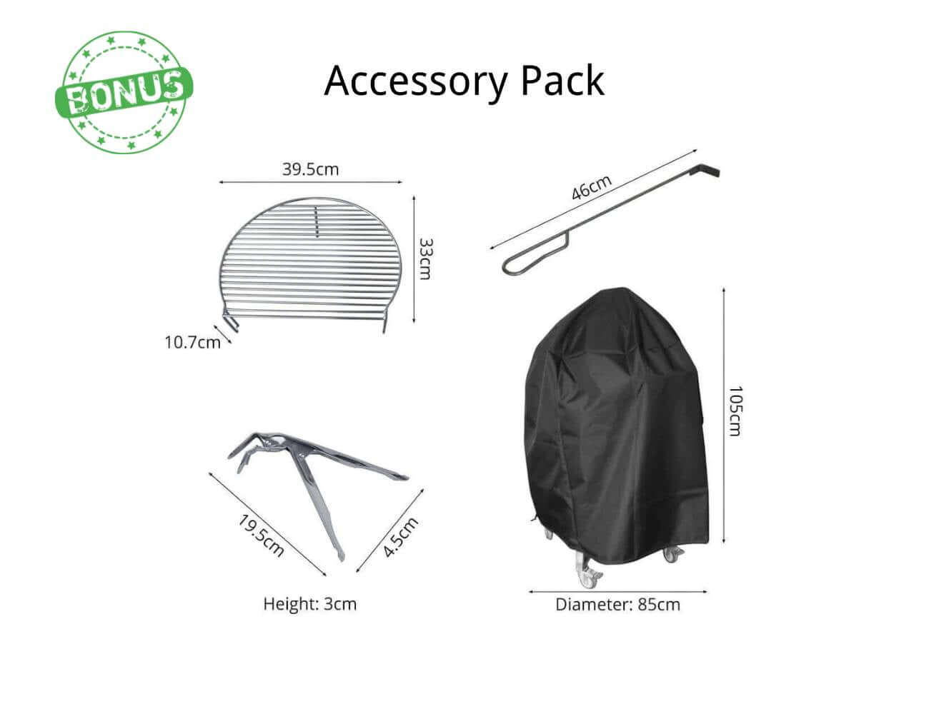 - Package includes: a grill expander, a grill gripper, ash tool and rain cover