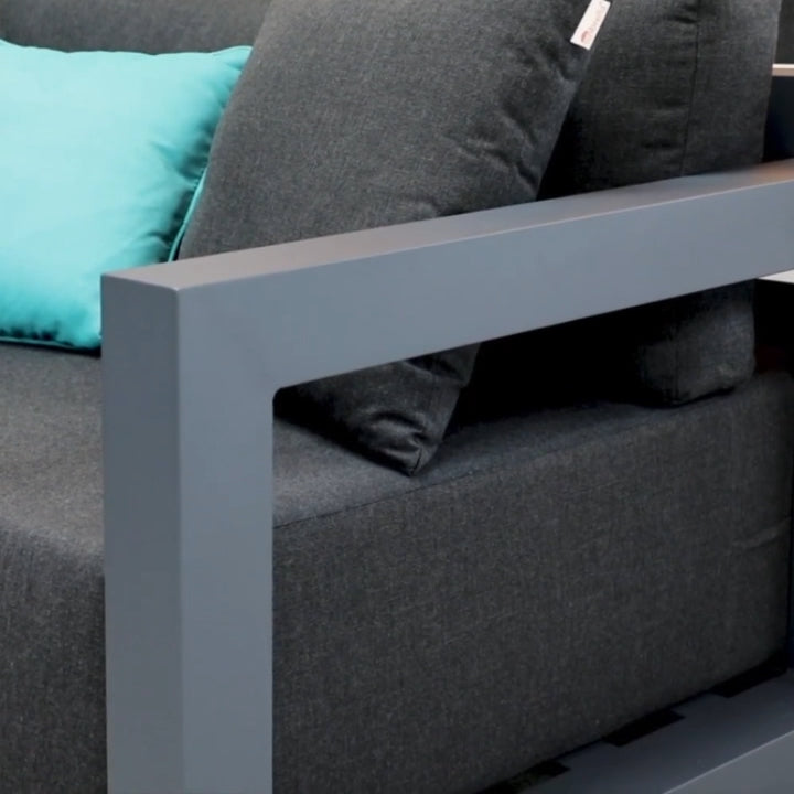 Add a touch of modern design to your home and outdoor spaces with the finely designed and luxurious Ibis oversized outdoor right sofa. This right segment can be bought on its own or paired with our centre chair and left sofa for an inviting addition to your outdoor space. Featuring powder-coated aluminium framing in deepest, trendy black, and strong bold lines framing the comfortable cushions, this right sofa features bold, clean lines making it ideal for anchoring your outdoor space.