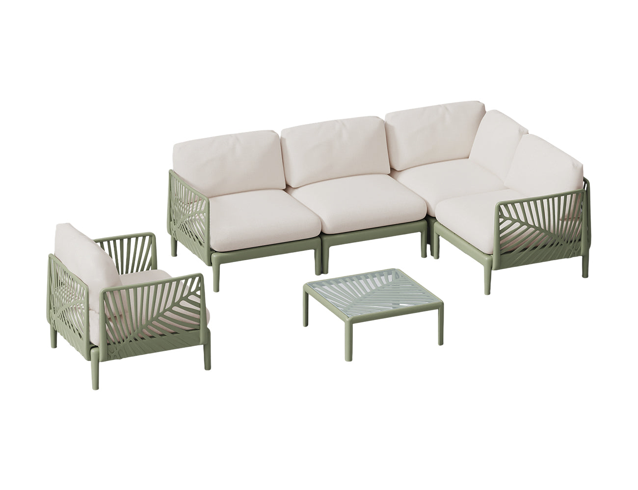 Unlike traditional metal or wicker, the Aspen’s molded frame is entirely rust-proof, UV-resistant, and will never unravel. The centerpiece is a modular 5-seater that connects securely for cozy seating or separates for easy transport and storage. Paired with deep, high-density foam cushions in a neutral beige, this set offers a modern, low-maintenance solution for outdoor living.