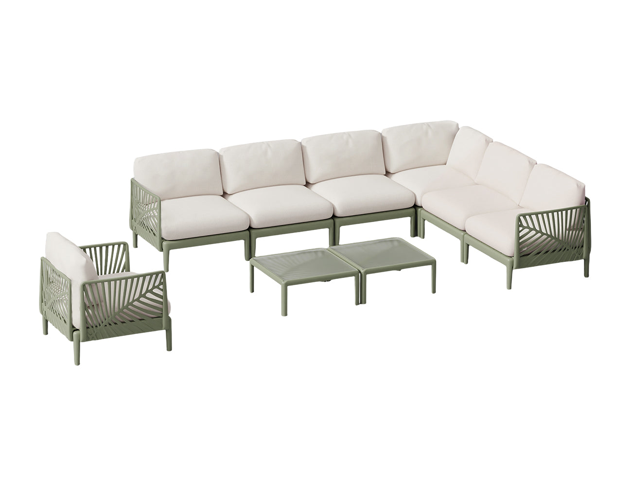Unlike traditional metal or wicker, the Aspen’s molded frame is entirely rust-proof, UV-resistant, and will never unravel. The centerpiece is a modular 7-seater that connects securely for cozy seating or separates for easy transport and storage. Paired with deep, high-density foam cushions in a neutral beige, this set offers a modern, low-maintenance solution for outdoor living.