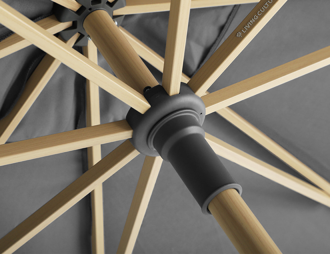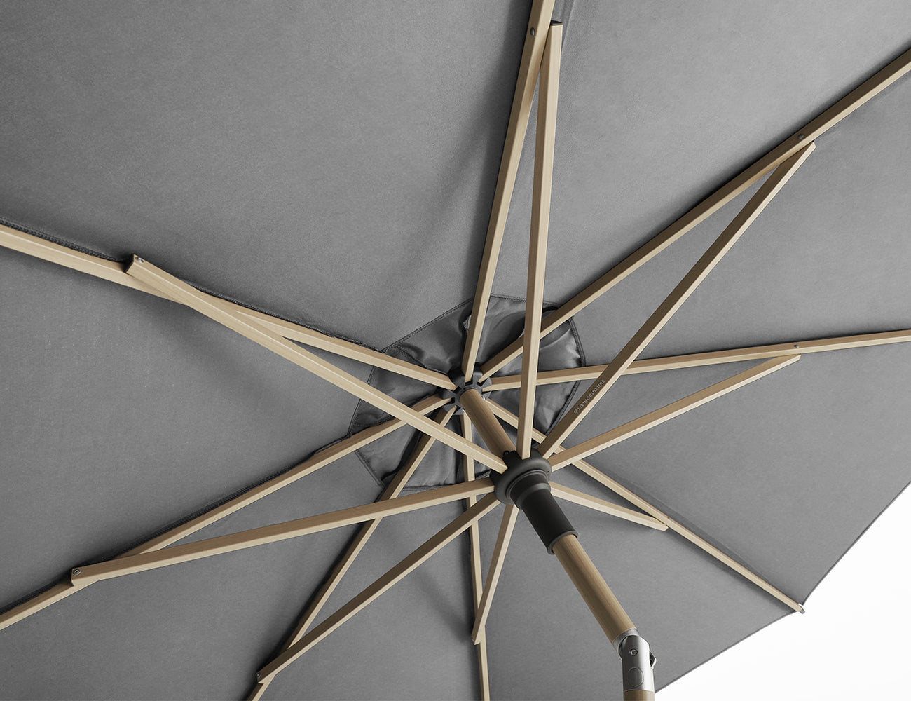 The Kryon 2.7m Round Market Umbrella brings natural charm. Its aluminum frame has the look of real wood, but won’t crack, warp, or fade with time.