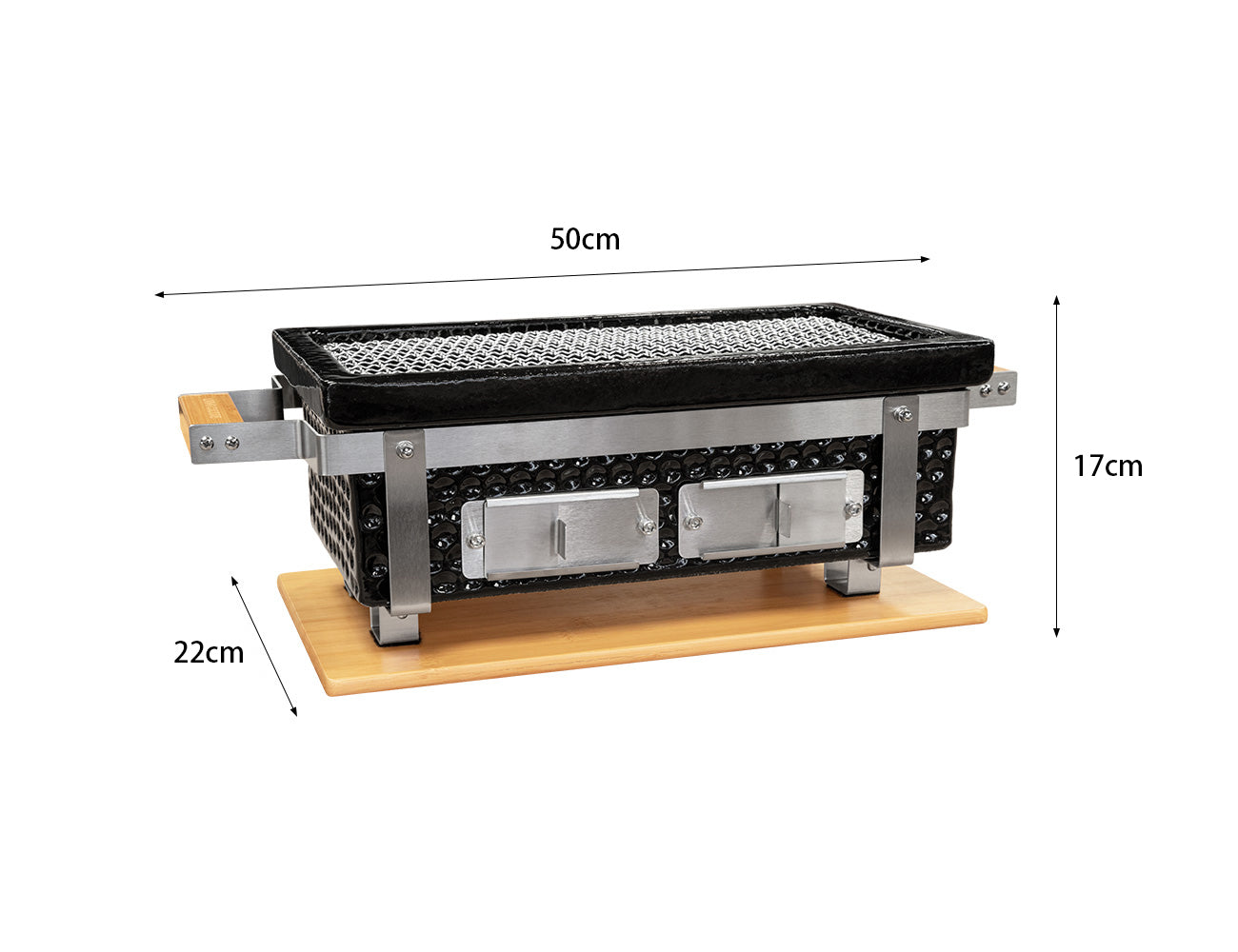 Material: Ceramic body, stainless steel stand, cast iron charcoal grate, bamboo handles and base plate