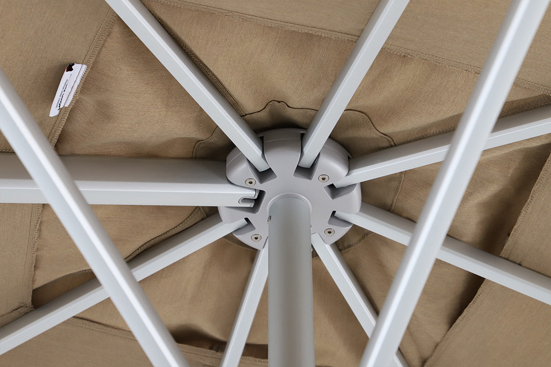 Featuring a sturdy aluminium pole with Matt anodizing for durability, it’s strong and can withstand light breezes and exposure to natural elements. Secured to a solid ground base it protects and stabilises the umbrella. The unique positioning of the pole on cantilever umbrellas keeps the space below the canopy unobstructed.