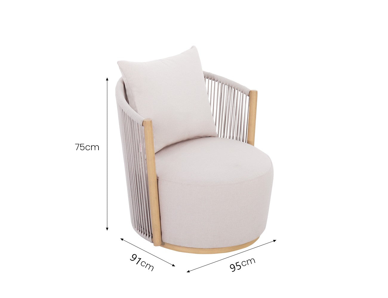 Durable aluminum frame paired with handwoven Olefin rope detailing on the arms creates a chic, textured contrast.