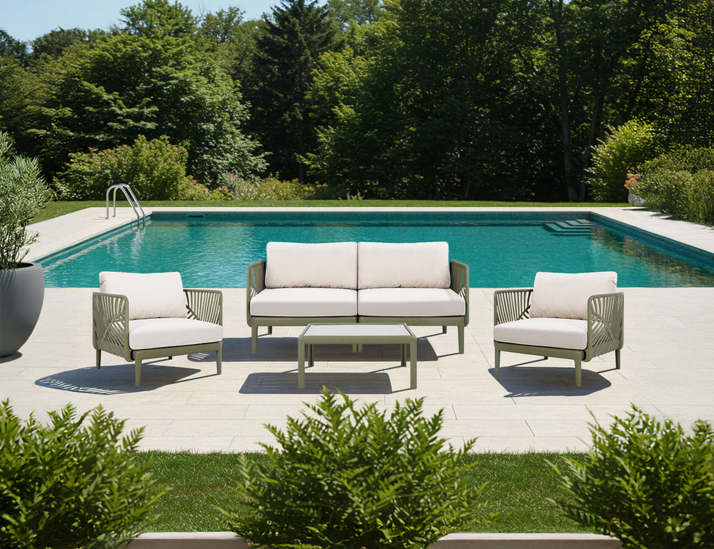 Crafted from GRS-certified recycled polypropylene, the sturdy frame offers exceptional weather and UV resistance, standing strong against sun, rain, and everyday use. Plush, removable cushions in soft neutral tones complete the look—comfortable, breathable, and easy to care for. Designed for everyday outdoor living, Aspen balances long-lasting durability with an inviting, contemporary charm.