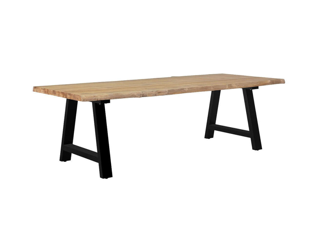 Constructed from reclaimed teak, the natural organic material adds unique character to your outdoor furniture. It's durable for outdoor use and weathers to a beautiful silvery grey patina. Paired with sleek black powder-coated aluminium legs, this table is a welcome addition to your outdoor area. Delivered in knock-down form, assembly is required. Ideal for family dinners in the open air and shared platters with friends, this outdoor dining table is an entertainer's essential.