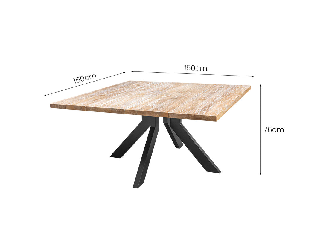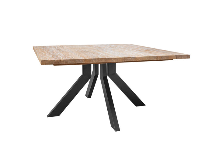 This square table has a top made of reclaimed teak wood, treated with whitewash that gives it a unique lifted texture. This material not only has a retro look but is also very durable and environmentally friendly.