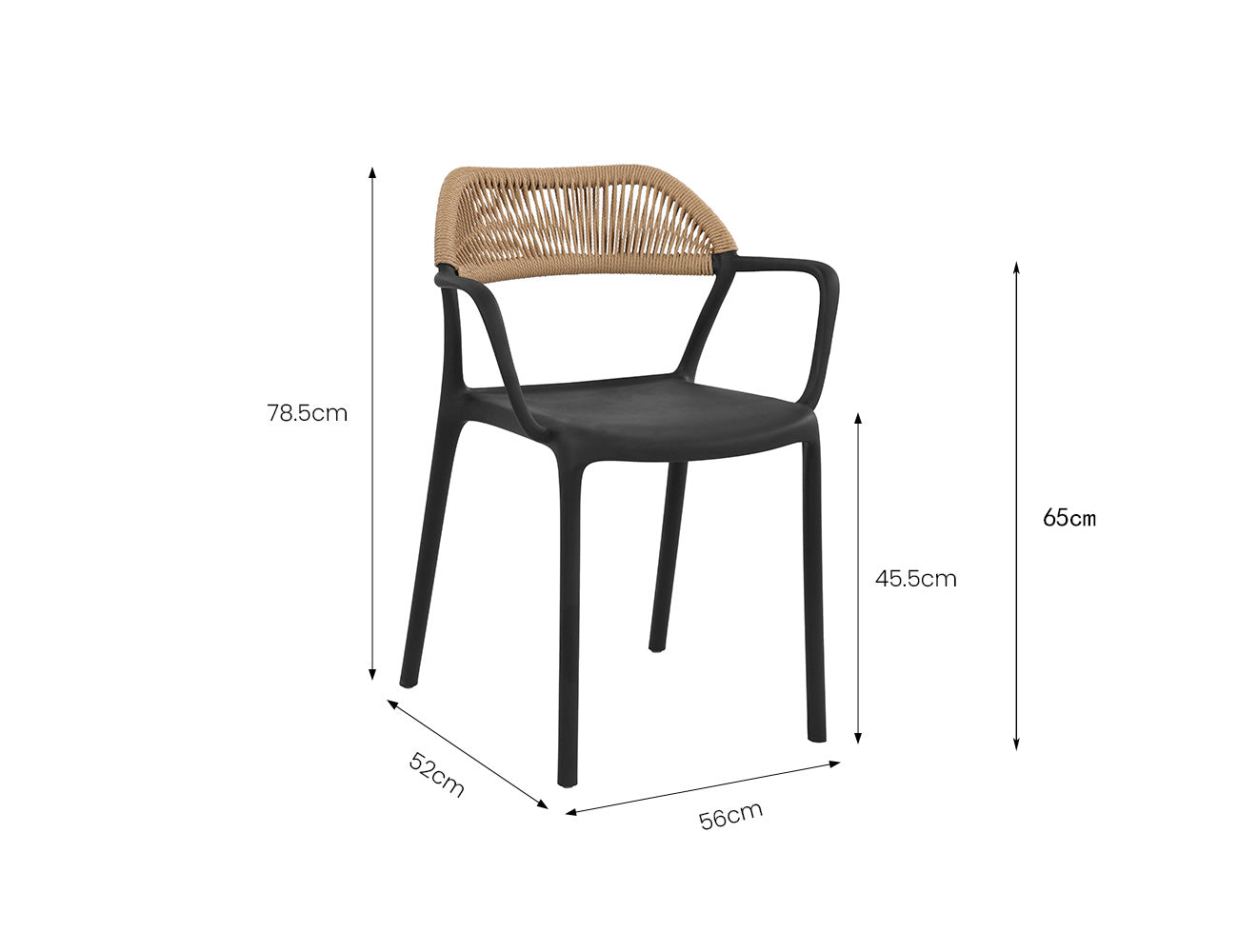 Designed for easy outdoor living, the Aiden Armchair combines durability, comfort, and style. Made from UV-resistant polypropylene with a woven rope back, it resists sun, rain, and spills while adding a touch of warmth to modern outdoor spaces. The chair is stable and supportive, yet lightweight enough to move around. After meals, simply wipe clean and stack for convenient storage.