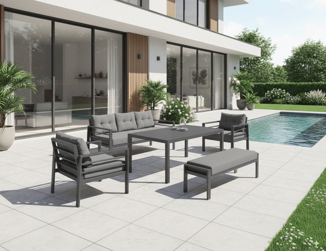 This 5-piece outdoor sofa set brings style and comfort to your garden, patio, or terrace. The complete set includes a three-seater sofa, bench, two armchairs, and a coffee table - all designed with clean lines and modern aesthetics. Built with premium materials, from the robust aluminum frame to the 12cm thick cushions wrapped in weather-resistant Olifen fabric, every piece is crafted for long-lasting outdoor use.