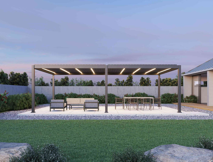 A motorised, ultra-strong aluminium louvre roof pergola that turns your outdoor area into a clean-lined, all-weather room, backed by a 10-year warranty.