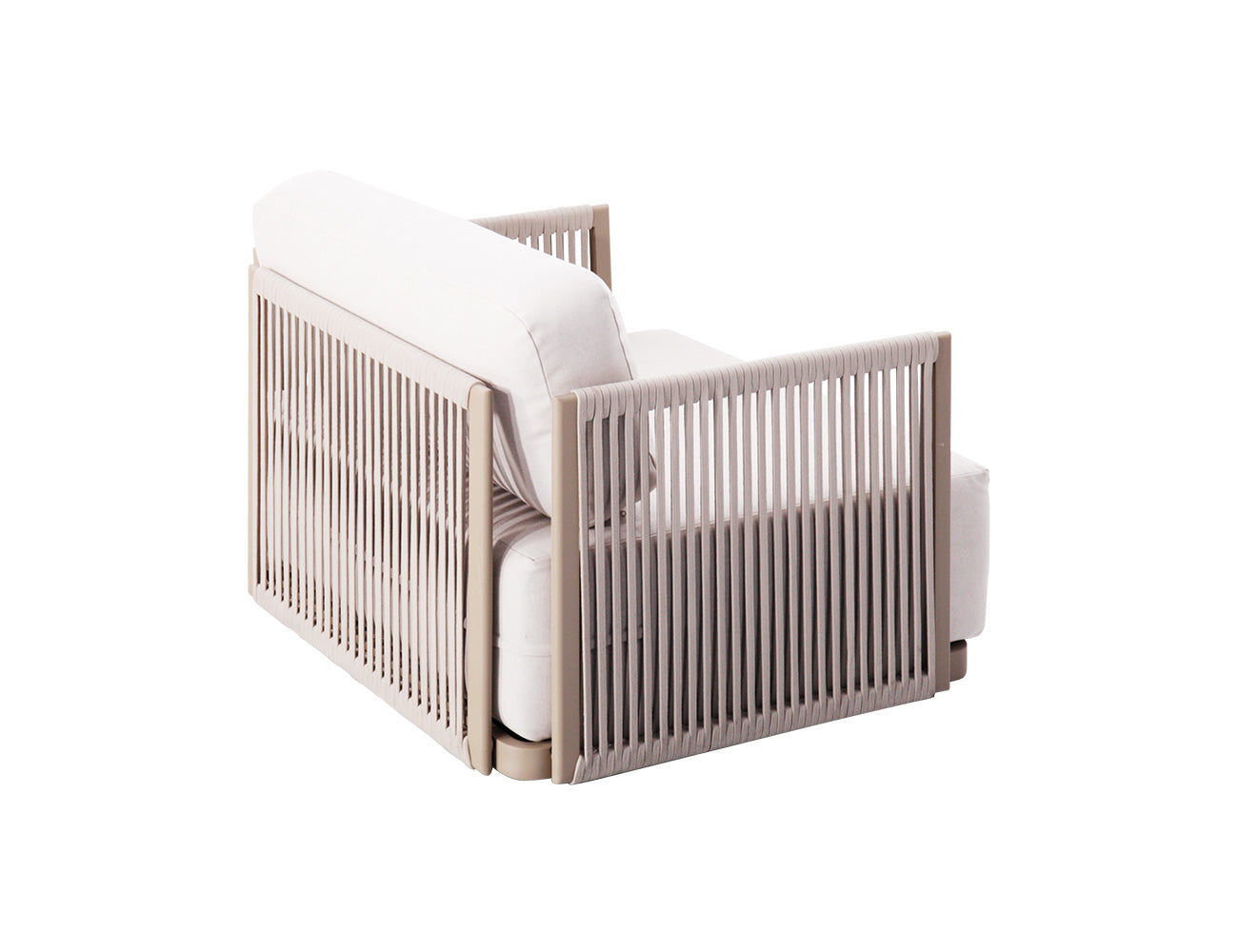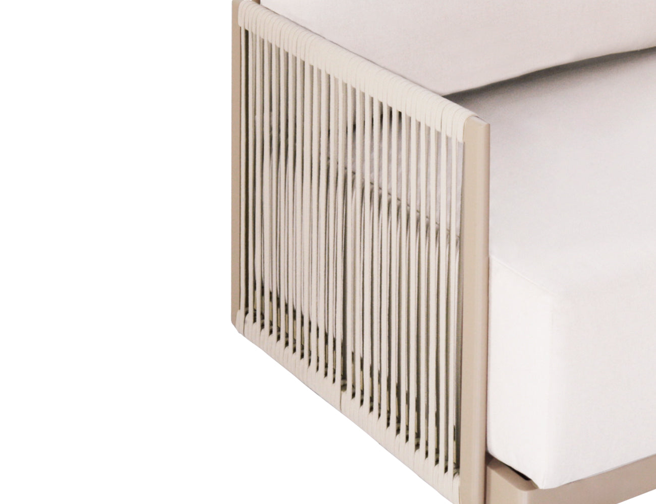 The cushions are wrapped in durable Sunbrella® fabric, resistant to fading, water, and stains. Quick-dry foam inside keeps cushions fresh even after rain, while softly braided Olefin rope armrests add a warm, tactile contrast to the sleek champagne-toned aluminium frame.