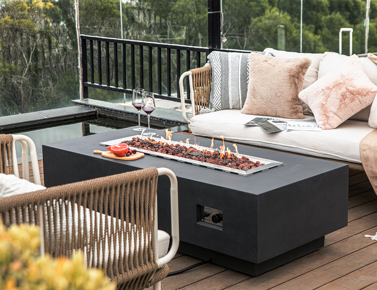 The fire pit itself sits in the center and includes a bed of lava rocks that create ambient heat and a mesmerizing flame effect. With an easy electronic ignition, adjustable flame, and built-in safety shut-off, you can enjoy the fire with confidence and convenience.