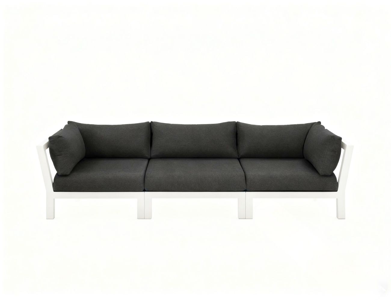 This modern, minimalist outdoor sofa features a sleek aluminum frame with angled armrests. The sofa uses Sunbrella® fabric and quick-dry foam, offering a stylish yet comfortable seating option for outdoor settings. The design includes three modular seats with thick, removable cushions for easy maintenance and versatile arrangement.