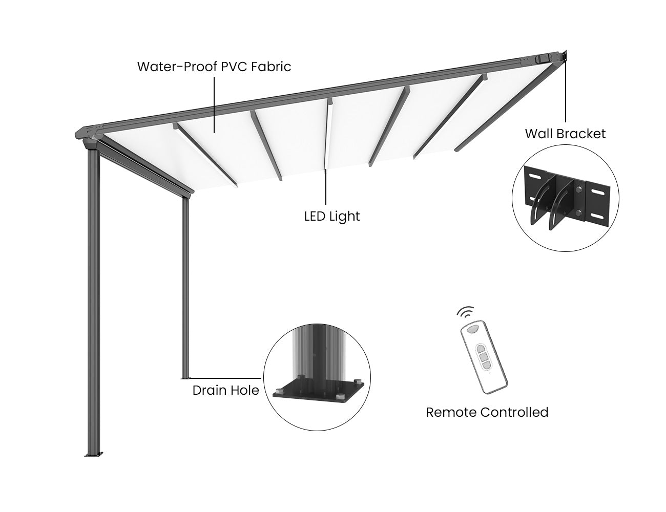 - Colour: Dark grey aluminium frame with white PVC fabric