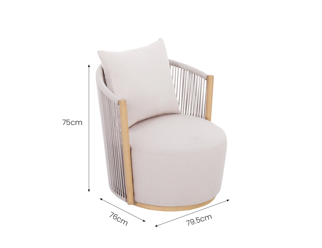 Durable aluminum frame paired with handwoven Olefin rope detailing on the arms creates a chic, textured contrast.